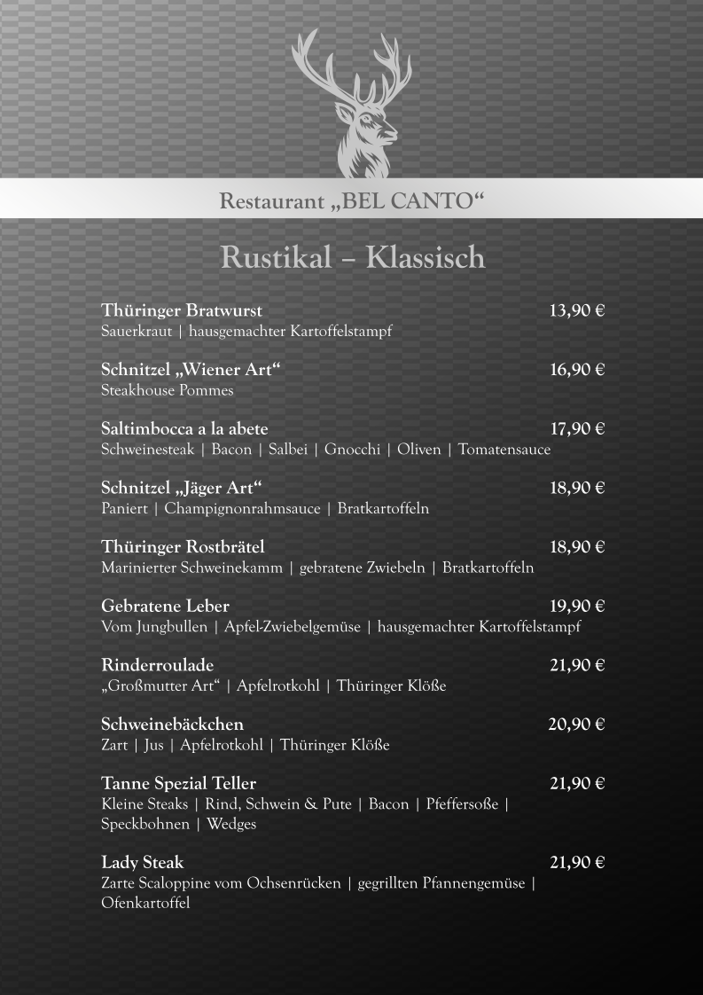 Welcome to Restaurant Bel Canto im Hotel Tanne Ilmenau, where culinary excellence meets a harmonious atmosphere. Nestled in the heart of Ilmenau at Lindenstraße 38, this gem captivates both locals and visitors alike. The menu features a delightful array of dishes, with standout items such as the succulent Rumpsteak and richly flavored Lady Steak, both highly praised for their superb taste and preparation.